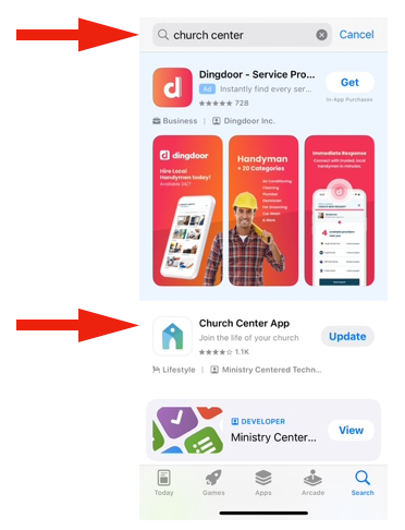 Go into your phone’s App Store and search, “Church Center”. Locate the “Church Center App” that is shown here and download it.