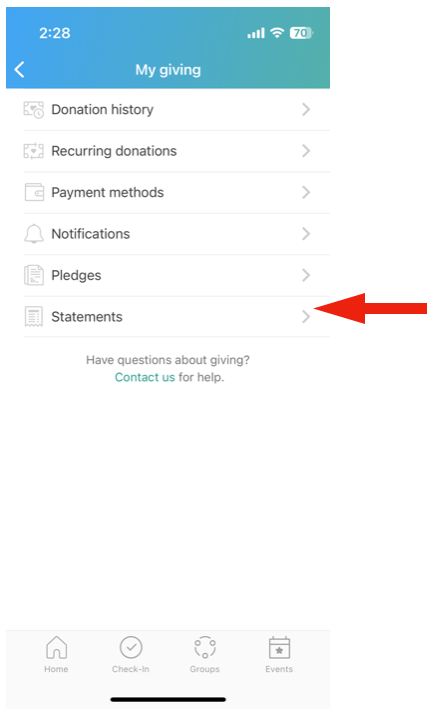 - If you have given your information, please following the steps below to access your giving history/statements by downloading the Church Center App (instructions are for iPhone, Android’s have a similar download setup).